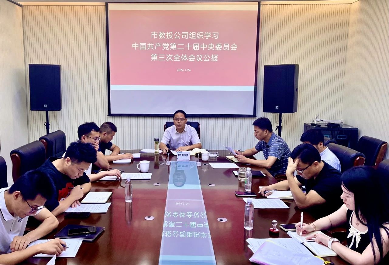 7月24日,市教投公司組織召開會議,傳達學習二十屆三中全會精神,研究部署貫徹落實意見。公司黨支部書記、董事長、總經理陳新根主持會議并講話。公司領導班子成員,各部門、下屬單位、業務條線負責人參加會議。