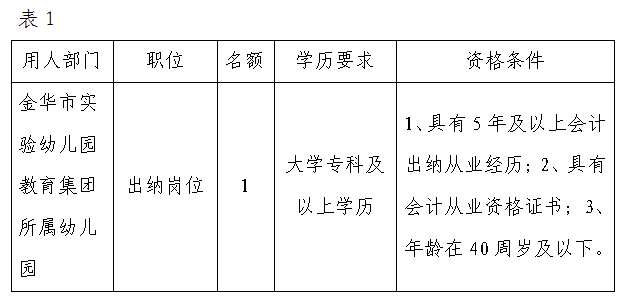 本次招聘人員1名,幼兒園出納崗位。